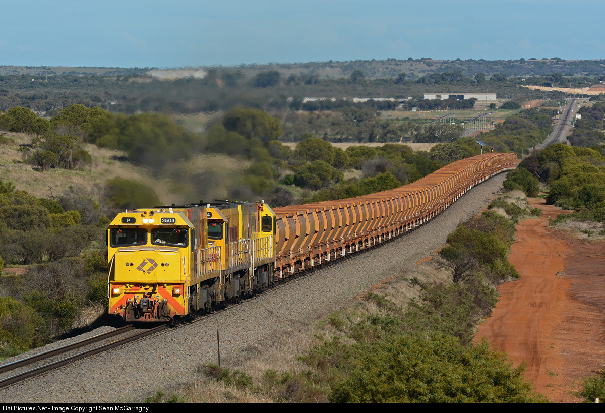 | The rollercoaster grades in the Midwest region are on show here as P2504, P2514 & P2505 work 3720 empty Geraldton to Perenjori ore climbing out the grade towards Moonyoonooka. |
