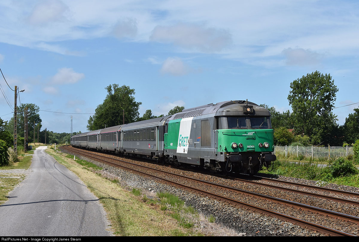 | Traditional loco-hauled trains are seeing out their final days before replacement later this year between Paris and Boulogne. North of Boulogne BB67400 diesels work their final InterCity trains for SNCF. Loco availability is now poor and it is not uncommon for DMU's to replace the locomotives. On other occasions such as this freigh locomotives are hired in to keep the trains running. 'Fret' BB67471 is seen heading south towards Rue with 2026 the 14:45 Boulogne - Amiens. This was the only locomotive in use on the line on this day. |