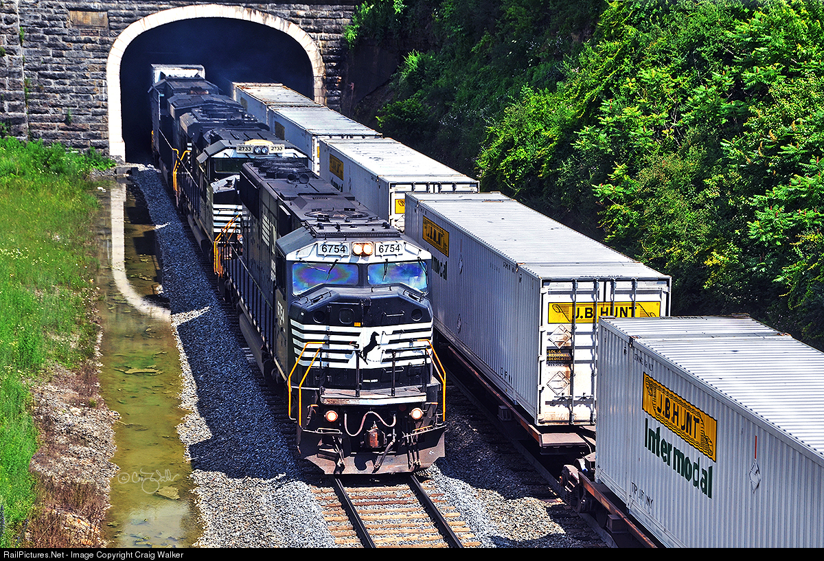 A westbound Norfolk Southern intermodal train exits the tunnel at Gallitzin, Pennsylvania, as an eastbound NS intermodal train enters the tunnel on June 26, 2017. The westbound is led by SD60I 6754 (the former Conrail 5640), SD70M-2 2733 and ES44AC 8130.