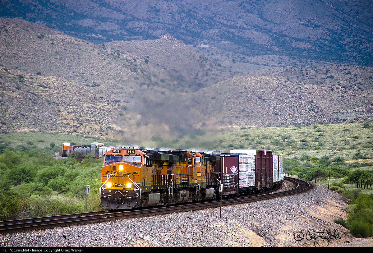 Slowly grinding uphill at Hackberry, Arizona, is BNSF Railway train H-BARBEL1-12, a High Priority Merchandise train heading from Barstow CA to Belen NM. On this hot August 12, 2017, afternoon, the train is powered by ES44C4 8319 and two Dash 9-44CWs (5331 and 4597).