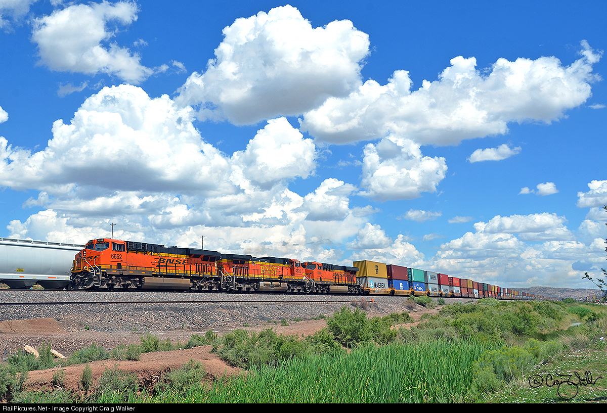 New Mexico often has spectacular skies, as was the case on August 13, 2017, as BNSF Railway intermodal stack train S-LPCLBT2-11 headed west out of Gallup. BNSF ES44C4 6652, BNSF Dash 9-44CW 4820 and BNSF ES44C4 8088 are in charge of the train, heading from Logistics Park Chicago IL to Long Beach CA's Pier T, which consists of 131 loads stretching for 11,822 feet.