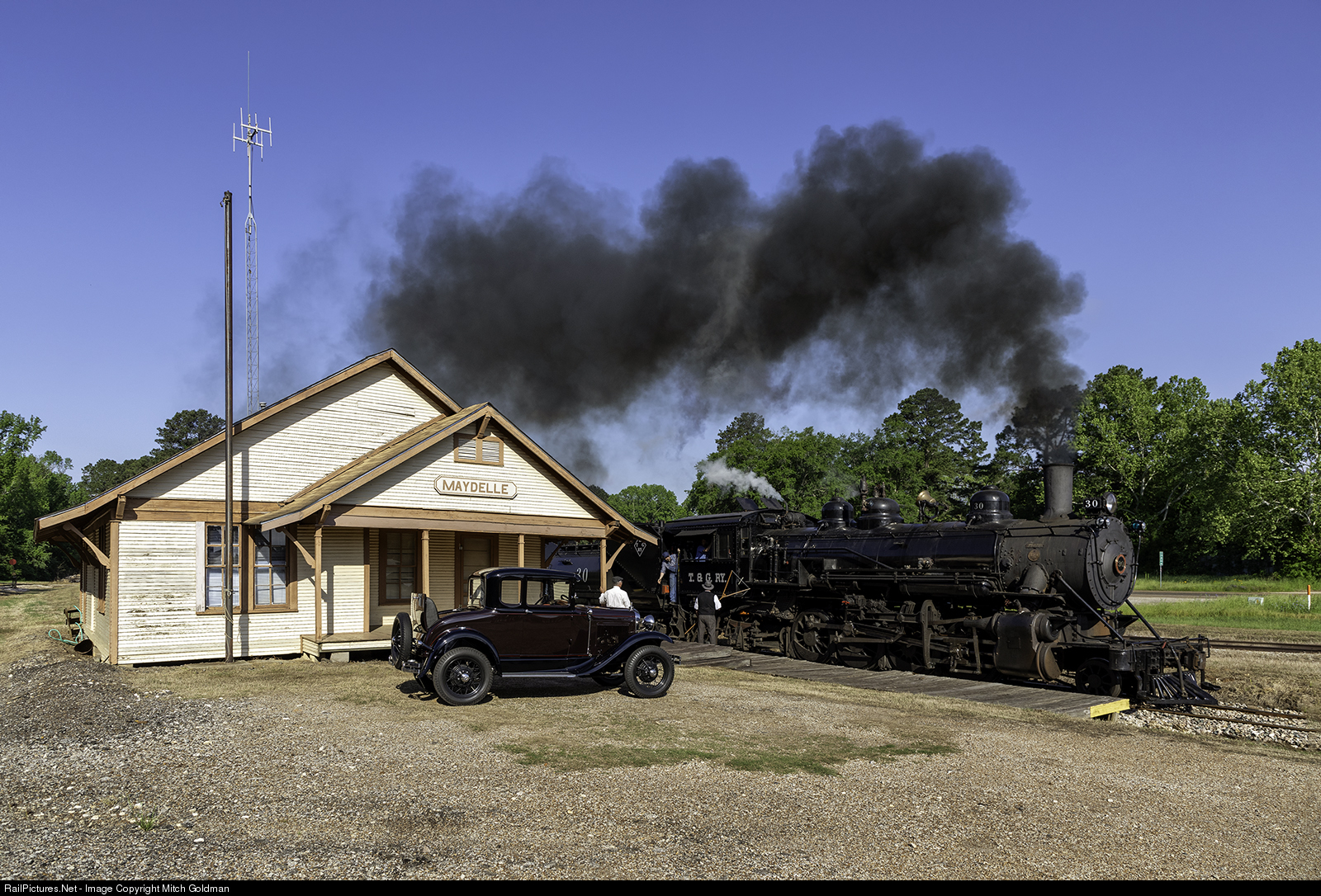 A crewman leans out of the cab to capture trainorders as Texas State Railroad's 2-8-2 No. 30 passes through Maydelle, TX, en route to Rusk. Part of a Lerro Productions charter at the Texas State Railroad. The original depot, long gone, was built in 1909. The depot seen here was built for the 1985 Roy Clark-Mel Tillis movie, Uphill All the Way.