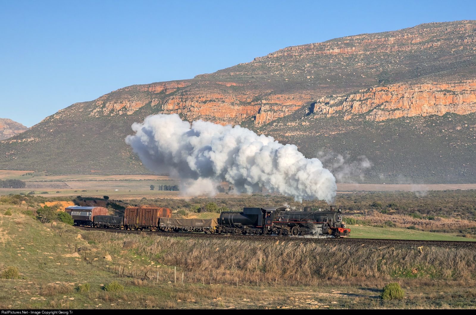 | 2-8-4 "Berkshire" steamlocomotive 24 # 3655 of the Ceres Rail Company/Atlantic Rail (owned by Cape Western Vintage Railways) was built in 1948/49 by the North Britisch Locomotive Company(NBL) in a series of 100 for the South African Railways (SAR), with a sixaxle MY (Buckeye 3-axle bogies) tender of 9 ton coal and 20 ton water capacity. This class served for branch line services with a maximum axle load of less then 12 ton. The locomotive is pulling the mixed freight/passenger FarRail Tours special southbound on the Klawer line between Het Kruis and Droeryskloof, with the Piketberg mountains in the background. |