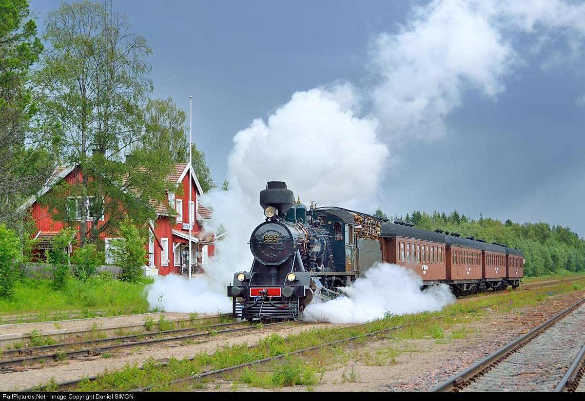 | The VR wood fired steam locomotive #995 is leaving the Vuokatti station with a passenger train under a threatening sky. A Dietmar Kramer - Sven Panjas charter. |