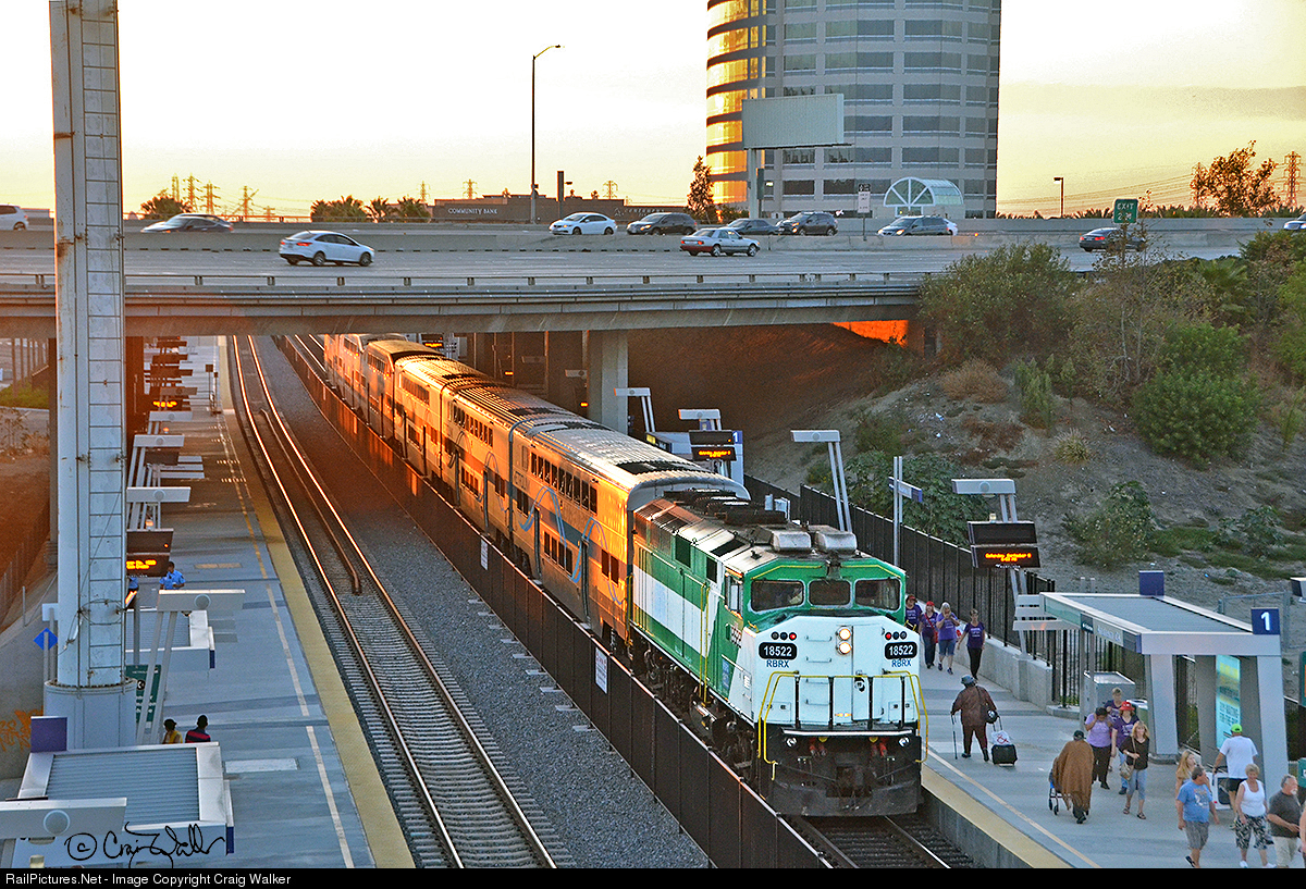 Metrolink commuter train 667 (Oceanside CA to Los Angeles CA) makes its stop in Anaheim, California (and underneath the 57 Freeway), on September 9, 2017. This six-car train is powered by leased F59-PH RBRX 18522, the former GO Transit 522.