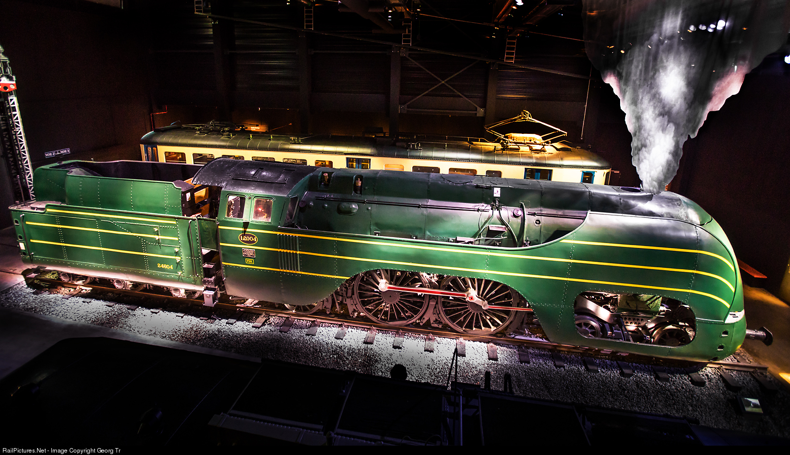 Impressive streamlined 4-4-2 "Atlantic" express train steamlocomotive 12 # 004 of the belgian railways SNCB/NMBS, exhibited in the Train World museum at Bruxelles Schaarbeek. Only six of this type were built in 1939 by Cockerill/Seraing with a maximum velocity of 140 km/h (87 mph) and about 2500 HP for express train services between Bruxelles and Oostende. The driving wheel diameter is 2100 mm or 6,89 ft. The french PLM and the american Milwaukee Road had successfully procured light trains with streamlined steam locomotives of the "Atlantic" type for this purpose. Based on these models, SNCB/NMBS and Cockerill developed a streamlined steam locomotive of the Atlantic type under the direction of their chief engineer Raoul Notesse. It was the last series of locomotives with this axle arrangement, at the same time they were the largest and heaviest European Atlantic locomotives ever built. The Train World railway museum in Bruxelles was opened in september 2015.