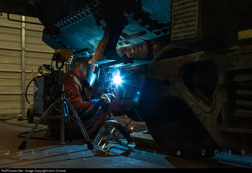 Randy, a volunteer for the Friends of the Cumbres & Toltec Scenic Railroad, makes welds in bolt holes below the coupler housing where a plate will hold the coupler's draft gear and the coupler itself. This was taken at the Friend's Car Restoration Facility in Antonito, Colorado, on June 28, 2019.