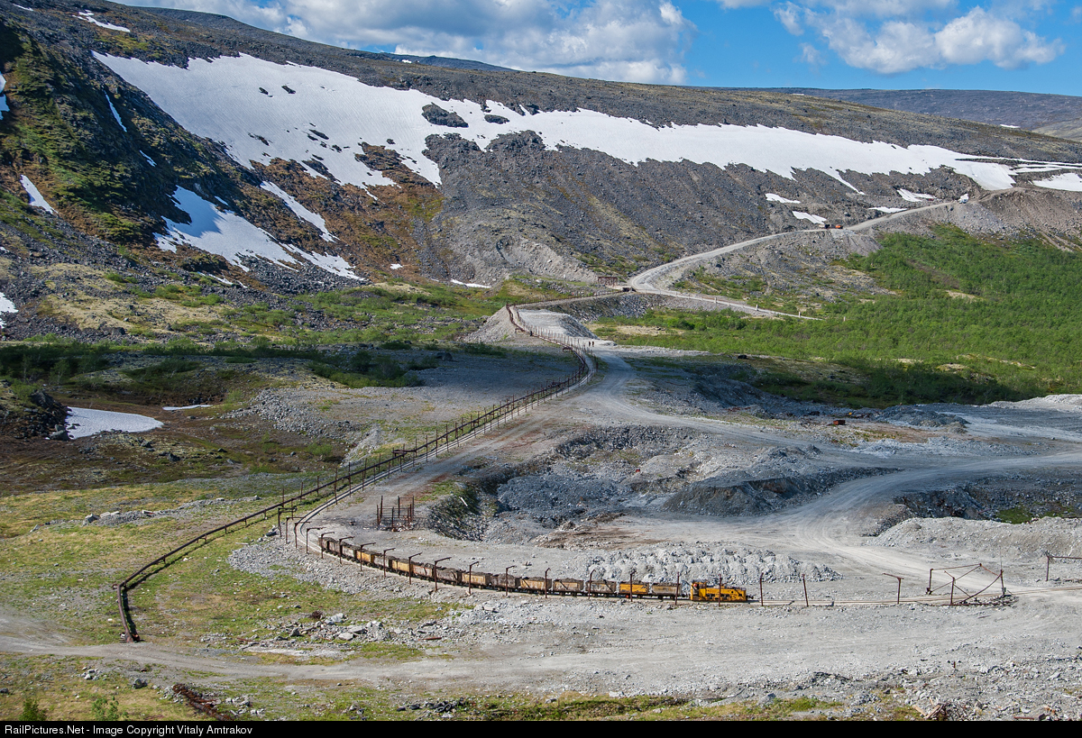 The K10-33 narrow-gauge electric loco is pulling a train loaded with the rare-earth metal ore from a mine to the Lovozersky Ore Concentrating Plant