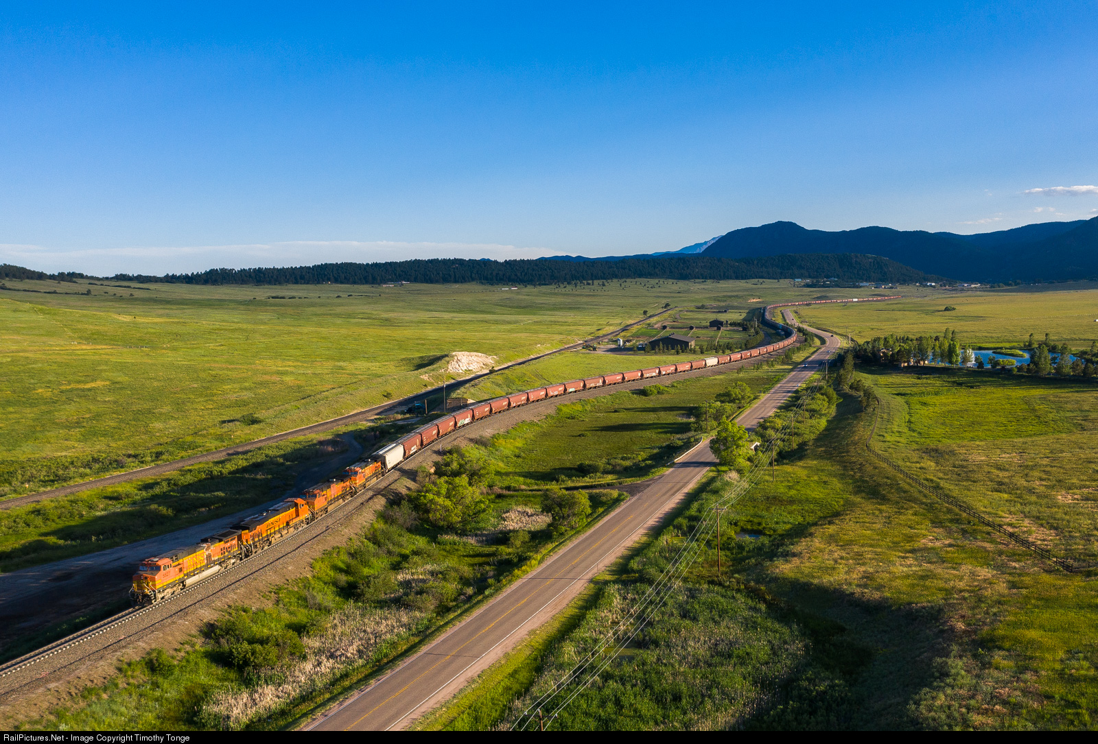 | Rear manned pusher BNSF 5527 assists a loaded grain train at Spruce, CO. The head end of the train is about 1/2 mile from Palmer Lake and the crest of the grade. Just ahead of the 2 unit pusher and 2 unit DPU set is where the flyover crossing was between the DRGW and ATSF, 100 years ago. |
