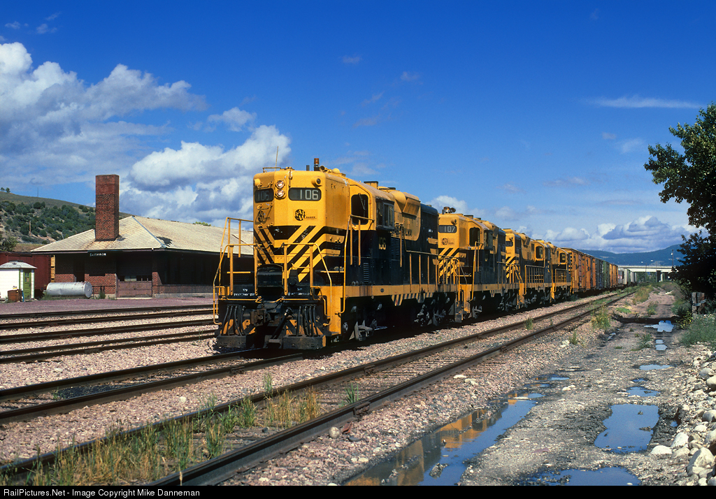 Powered by a quartet of leased Rarus Railway EMD GP9s, still decorated in the same colors when delivered new to predecessor Butte, Anaconda & Pacific, a Montana Western Railway freight arrives at Montana Rail Link’s yard at Garrison, Montana, on August 26, 1993. MRL’s former Northern Pacific Garrison depot is in the background.