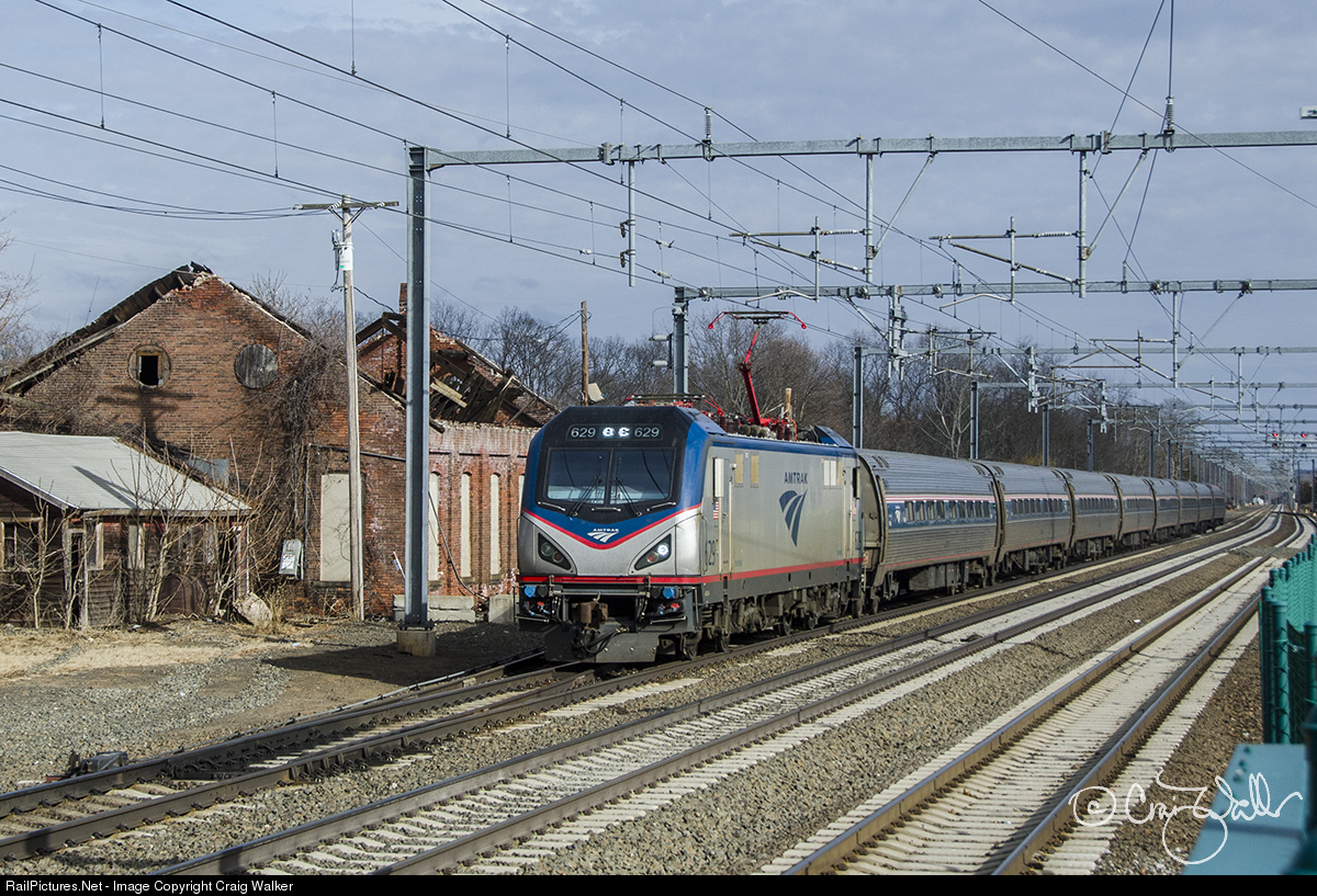 Amtrak train 173, a Boston MA to Washington DC Northwest Regional, speeds past the old New Haven Railroad steam locomotive enginehouse in Guilford, Connecticut, on January 29, 2018. This eight-car train is powered by AMTK 629, one of the carrier's Siemens-built ACS-64 "Cities Sprinter" electric locomotives.
