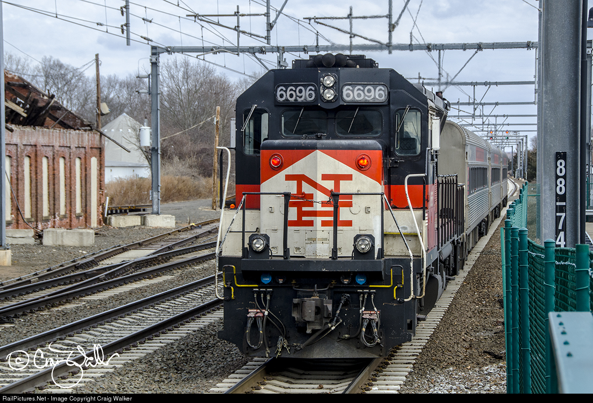 An eastbound Shore Line East commuter train departs the station in Guilford, Connecticut. ConnDOT's passenger trains are operated by Amtrak, and consist of Mafersa-built cars acquired from Virginia Railway Express. A variety of locomotives are assigned to these trains, and on January 29, 2018, one of ConnDOT's GP40-2H diesels is shoving on the rear of train 1622 (New Haven CT to New London CT). CNDX 6696 was built by EMD as Chesapeake & Ohio GP38 3875, renumbered to CSXT 2075 when that merger was created. It was rebuilt into a passenger locomotive by AMF Technotransport in 1996, and painted in the classic New Haven "McGinnis" paint scheme - and is the last active of these painted this way! It is due to head off to be rebuilt - and repainted into a new scheme - in March 2018. The train is passing an old New Haven enginehouse, which serviced steam locomotives many years ago.