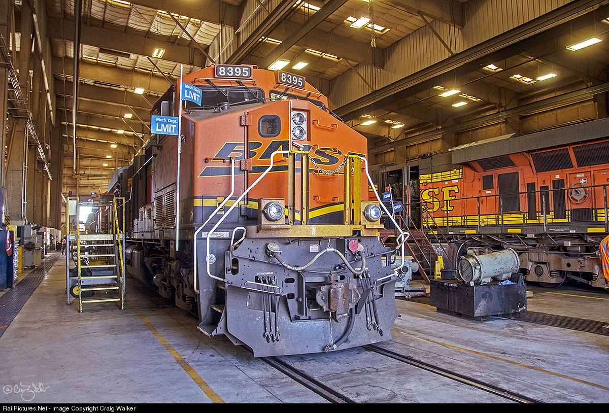 Iron horses cannot run all the time, as they occasionally need some rest and rehabilitation. On February 16, 2018, BNSF Railway ES44C4 8395 joined some others in the "stable" for routine maintenance at the Diesel Shop in Barstow, California. This is the BNSF's primary locomotive shop for its rail lines in California. Photographed on railroad property with permission and full Personal Protective Equipment (PPE).