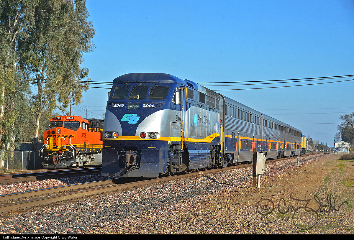 Amtrak train 714, a Bakersfield-bound San Joaquin, departs Merced, California, after its station stop and crew change on February 17, 2018. California Department of Transportation (aka Amtrak California) Non-Powered Cab Unit 90218 is on the point, and CDTX F59PHI 2006 is on the rear, providing all the muscle.