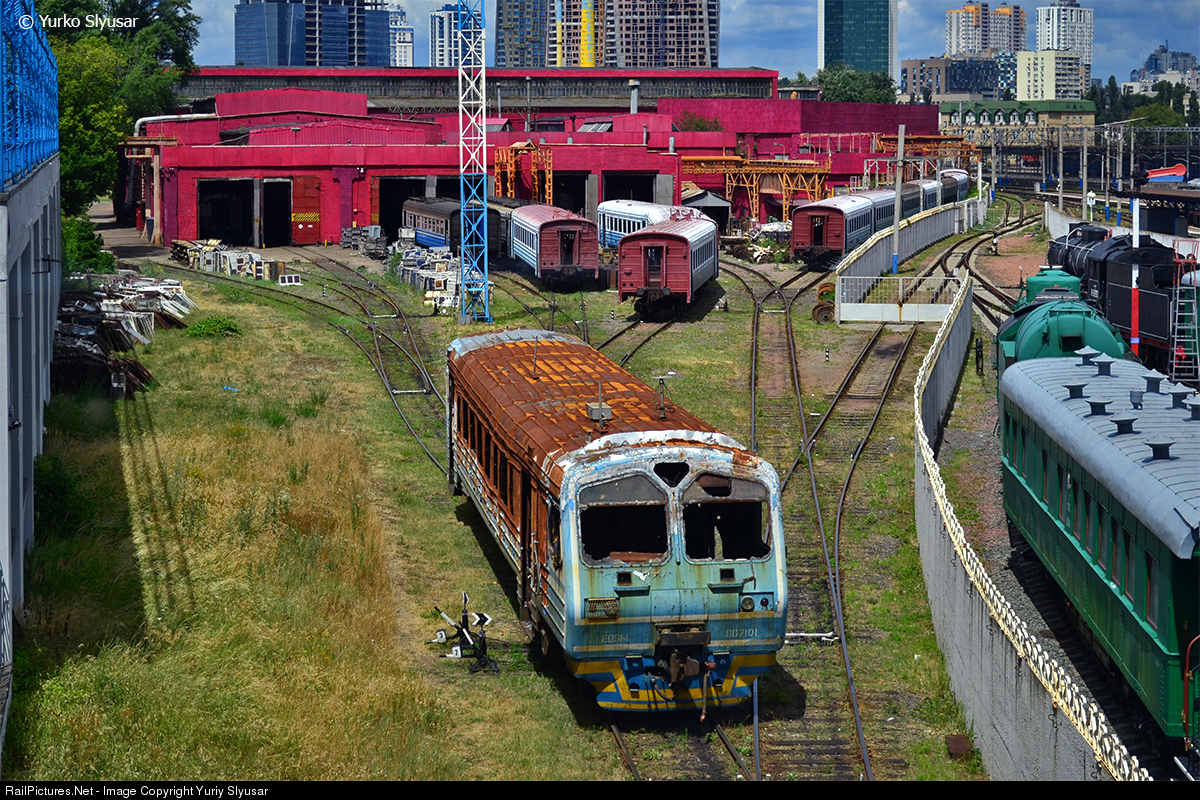 The head car of electric train ED9M-0071(01) on the territory of the Kyiv Electric Car Repair Plant (KEVRZ). In December, 2017 this head car burned at the Yahotyn station. Also the electric train ED9M built by the Demikhovsky Engineering Plant in 2003