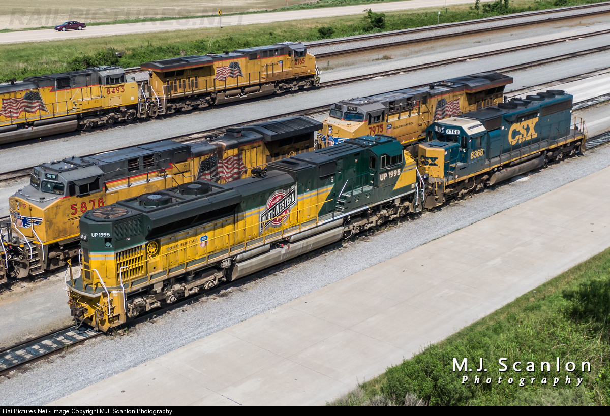 The Chicago & Northwestern heritage unit UP 1995 is among several engines at the fuel pad of Union Pacific's Marion Intermodal Railport in eastern Arkansas near Memphis. Also seen - CSXT 8368, UP 5878, UP 7975, UP 8493 & UP 2765.