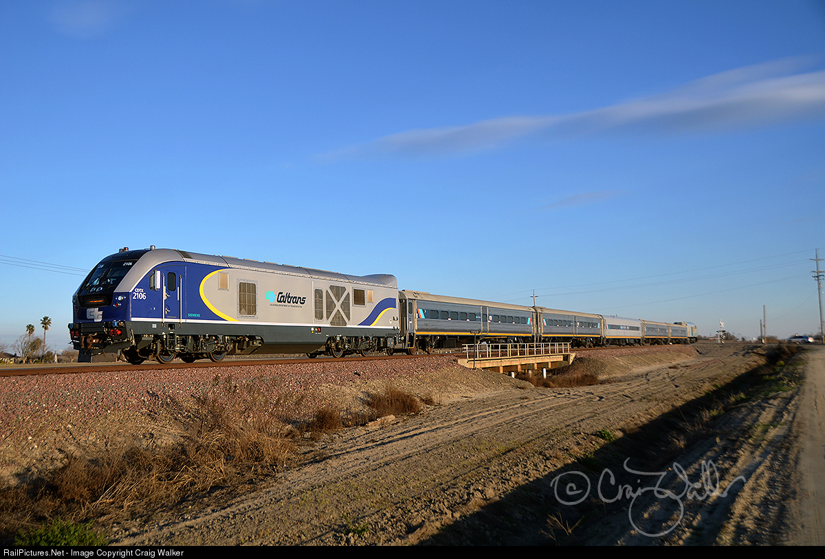 Amtrak train 719, a westbound San Joaquin heading fro Bakersfield to Oakland, speeds through Blanco, just south of Corcoran, California, on February 20, 2018. These Amtrak trains operate with equipment owned by the state of California - in this case, a Siemens SC-44 "Charger" locomotive (CDTX 2106), five passenger cars (four ex-NJ Transit Arrow I "California Comet" coaches and one Horizon food service car), and a former Amtrak F40PH locomotive converted into a non-powered control unit.