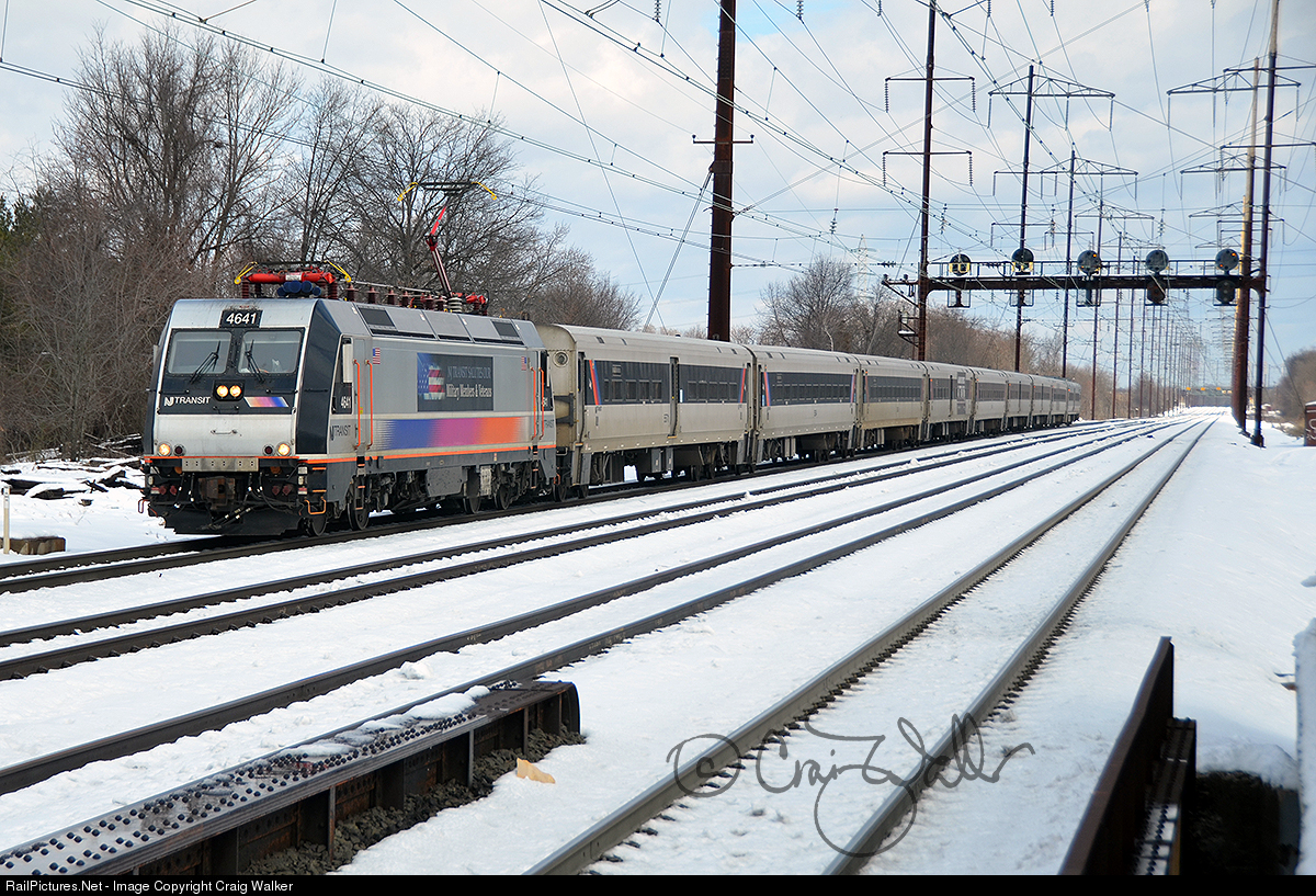 NJ Transit train 3839, heading from Penn Station in New York, NY, to Trenton, NJ, approaches the station in Edison, New Jersey, two days after a big snow storm hit the state. ALP-46 4641, built by Bombardier, leads the nine-car train on March 9, 2018. On its flanks, NJTR 4641 carries a banner proclaiming the carrier's support for America's military members and veterans.