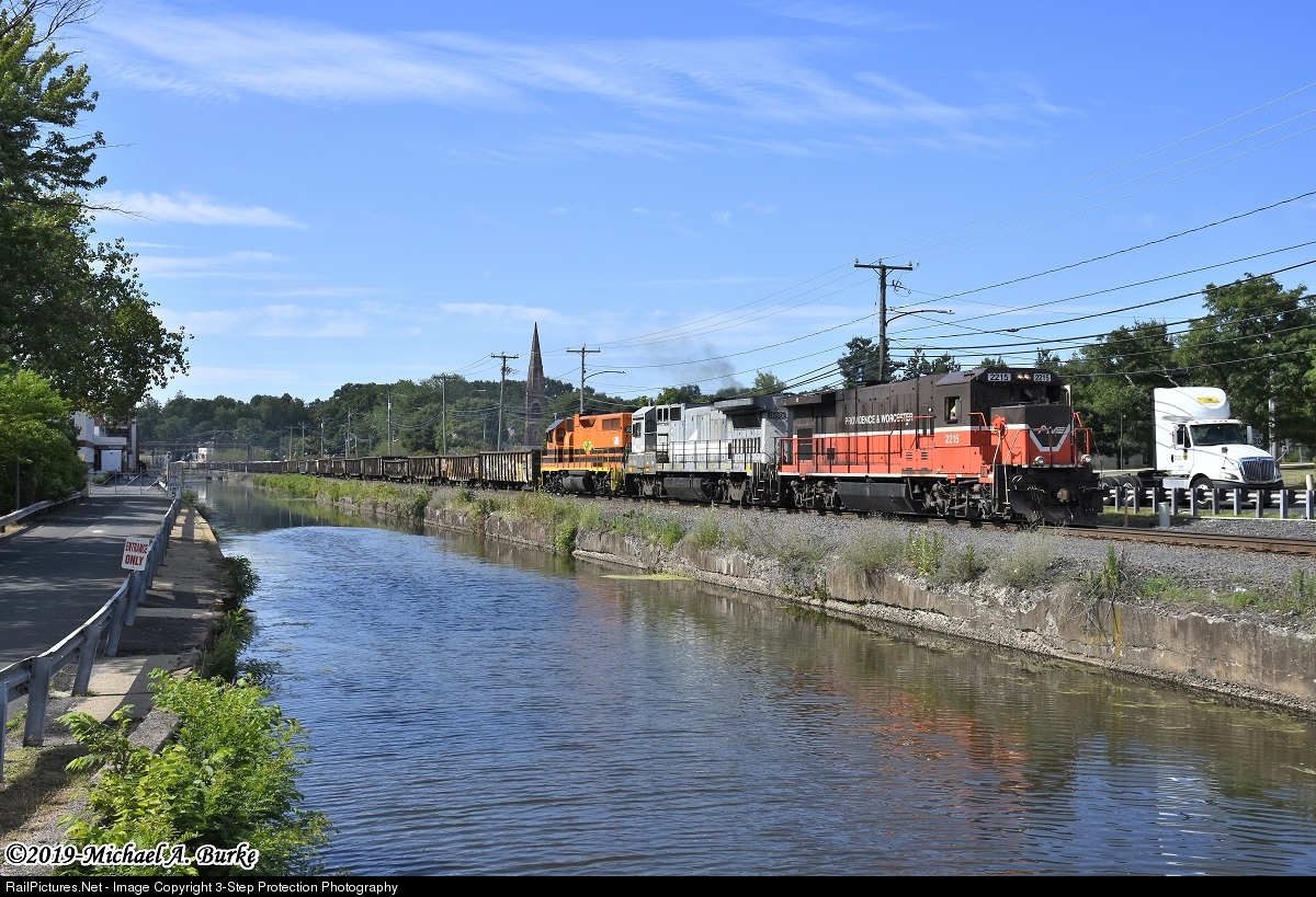 A variety of power leads Connecticut Southern CSO-4, as it parallels the Windsor Locks Canal, in route to interchange with CSX in West Springfield, MA. The morning consist includes Providence & Worcester B23-7R 2215, former LMX Leasing B39-8 8530, stenciled for the Ohio Central and New England Central GP38-2 2048.