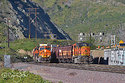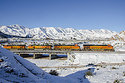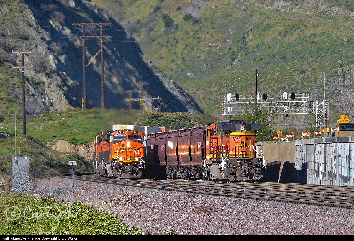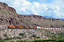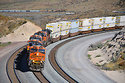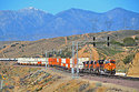 On April 21, 2018, as BNSF Railway grain train G-BARVEC1-18 heads west downgrade through Blue Cut, in Cajon Pass, BNSF train Z-SBDALT9-21 (Priority UPS - LTL Intermodal, San Bernardino, California, to Alliance, Texas) makes it was east as it heads uphill. The double-stack train is led by ES44DC 7869. Not far behind the eastbound, on the third mainline, is an eastbound Union Pacific train. Motorists at the grade crossing just to the right had a long wait as the gates stayed down for all three trains.