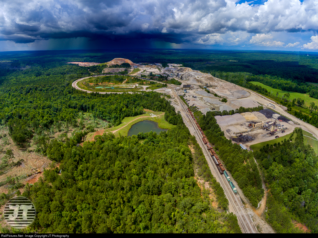 | Nestled deep in the Alabama Pines, CLCX 6120 & 6121 sit at the south end of Vulcan's unique track layout. Meanwhile a nasty summer thunderstorm rushes toward us. Just 5 minutes after landing, the area would be receiving close to 3 inches of rain. This is a former Florida Rock property - now Vulcan Materials Notasulga Quarry. |