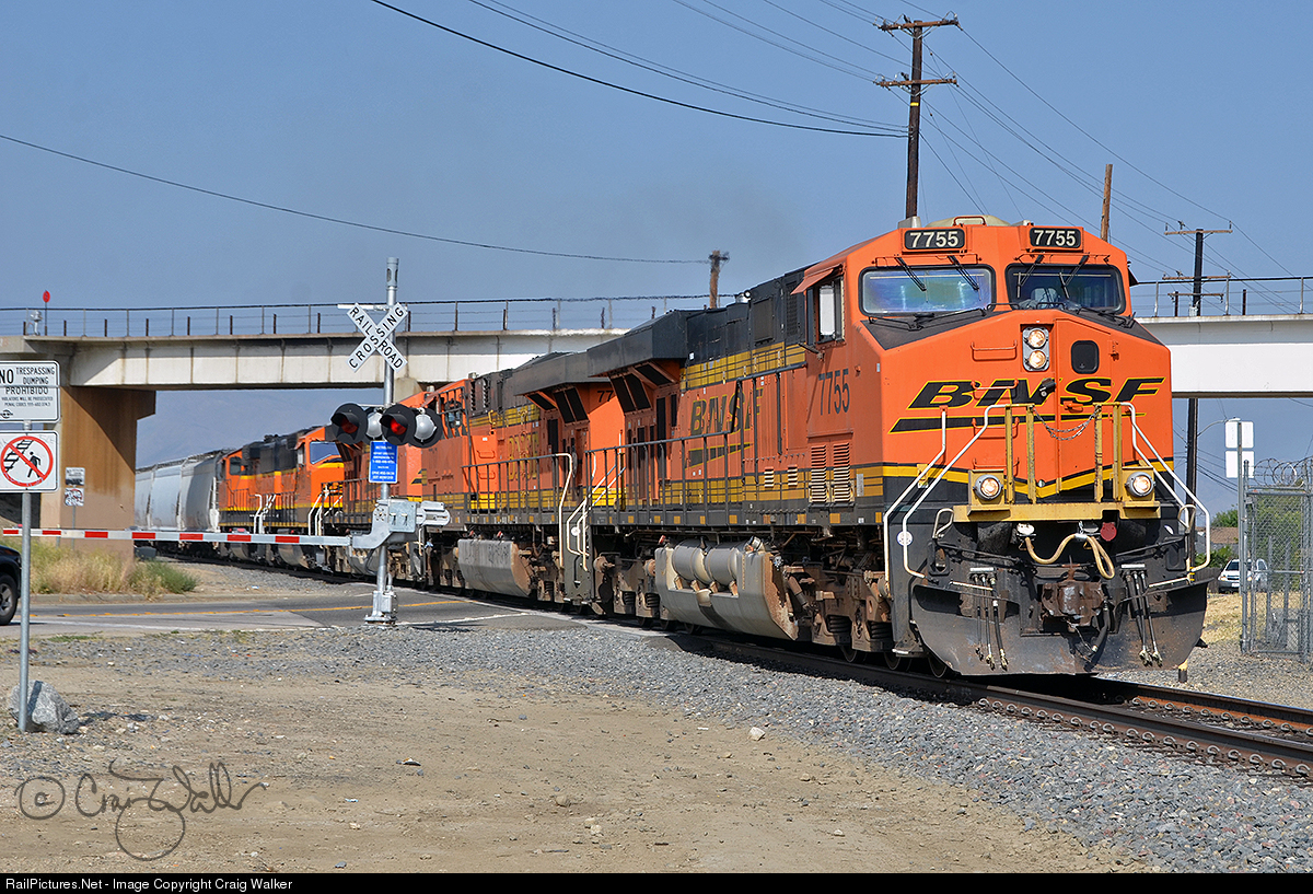 On the afternoon of April 28, 2018, BNSF Railway train M-BARKAI1-28A heads west on Metrolink's San Gabriel Subdivision (formerly Santa Fe's Second District) passes under the Union Pacific's Mojave Subdivision (the former Southern Pacific "Palmdale Cutoff"). This train transferred from the BNSF's Cajon Sub in San Bernardino to Metrolink's line to Los Angeles in order to complete its journey from Barstow to Kaiser Yard in Fontana. Following the three lead ES44DCs (7755, 7717, 7701) are a pair of GP60Ms (155 and 119) which, after arrival, will be working on locals originating in Kaiser. On the rear are two more diesels - BNSF ES44DC 7722 and BNSF ET44C4 3751. BNSF 3751 must've gone through an extensive restoration, as it looks nothing like it did when built in 1927 as Santa Fe 4-8-4 3751! It looks more like a GE than a Baldwin now. (And, yes, I am fully aware that ATSF 3751 and BNSF 3751 are not the same locomotive.)