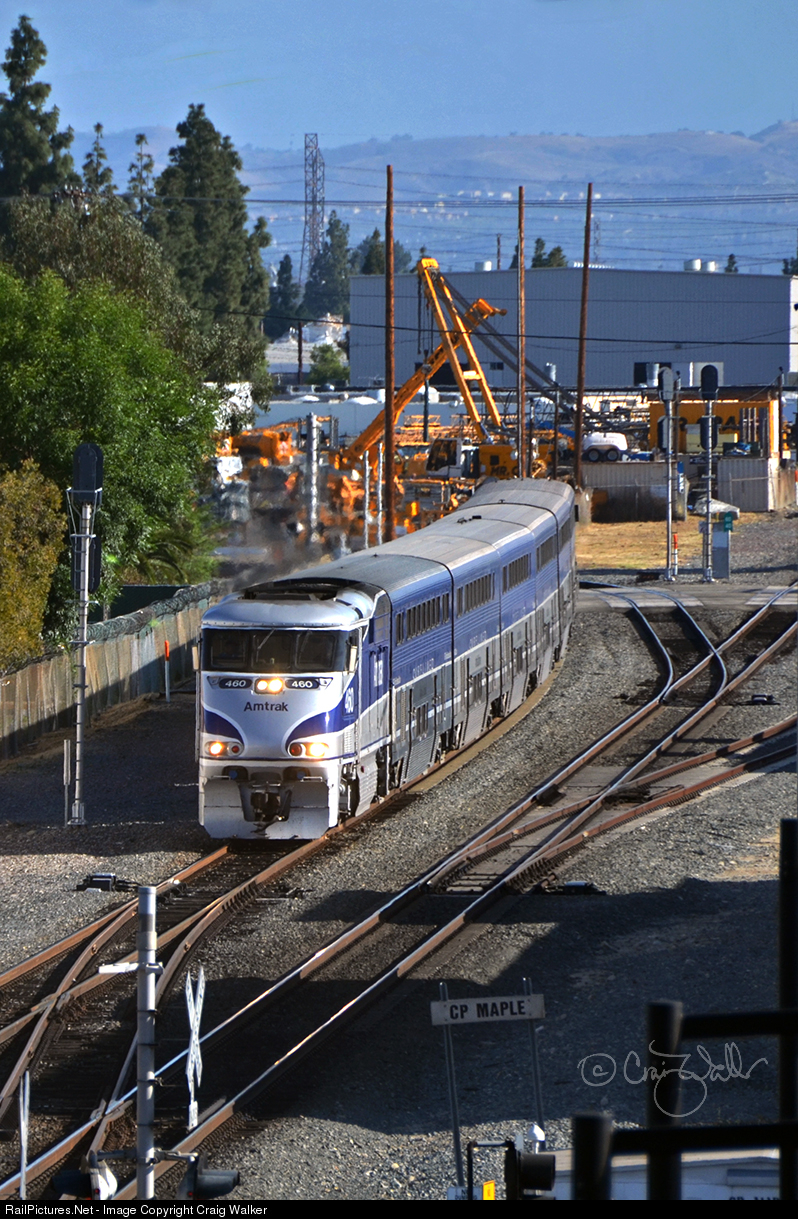 Rounding the curve into Orange, California, is Amtrak train 564, heading for San Diego from Los Angeles. This location is CP Maple, where Metrolink's Orange Subdivision (on which this train is operating) has a junction with the Olive Subdivision (the two tracks diverging to the right, heading to the BNSF's mainline at Atwood (the old Santa Fe station name for what is now the eastern part of Anaheim) and, beyond that, Riverside, San Bernardino and, eventually, Chicago.