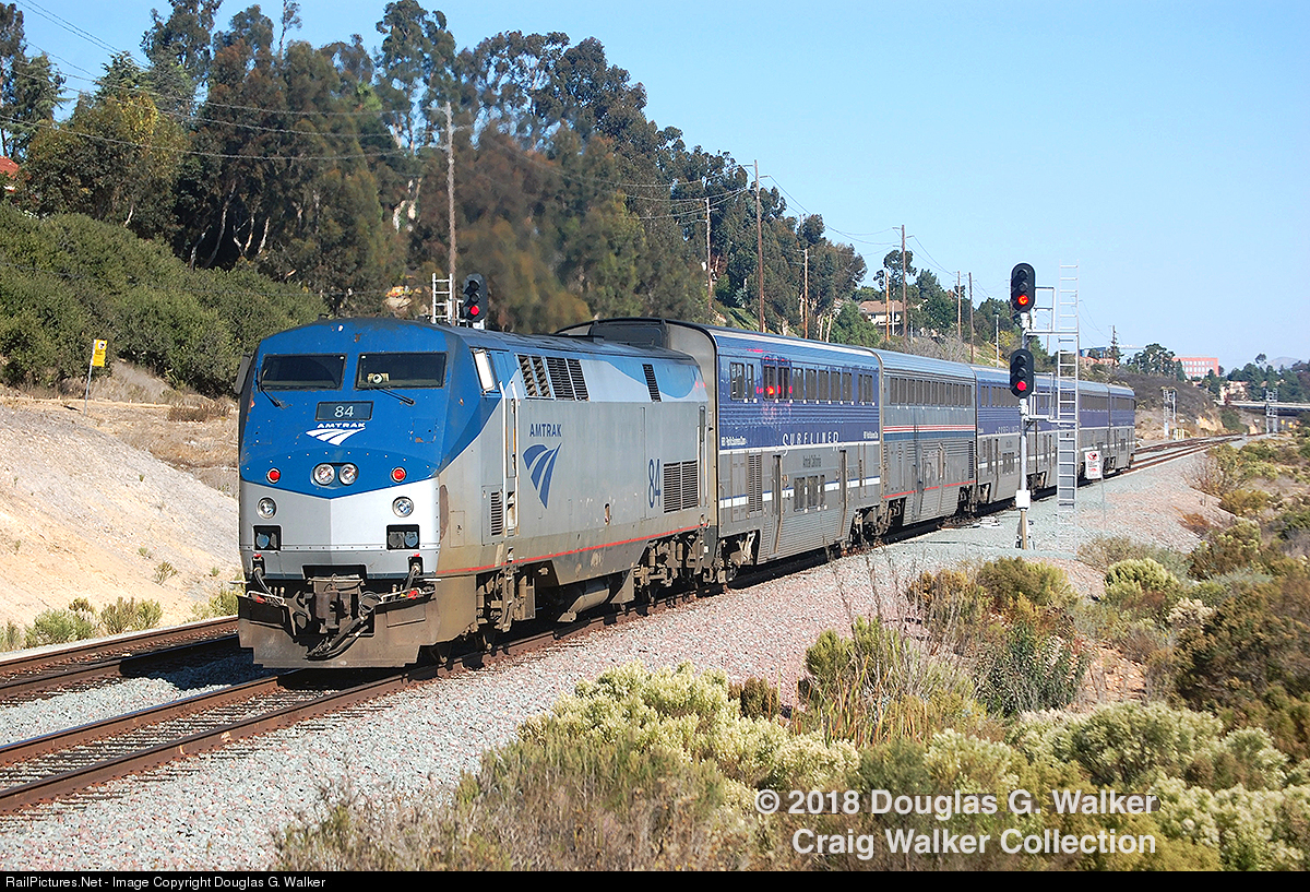Amtrak Pacific Surfliner 579 traverses San Diego's Rose Canyon as it heads north from San Diego to Los Angeles on November 9, 2018. As the Surfliner's F59PHIs are slowly sent east to Chicago, and their new owner Metra, Amtrak P42DCs - such as AMTK 84, seen here - are filling in as the new Siemens SC-44 diesels are slowly arriving.