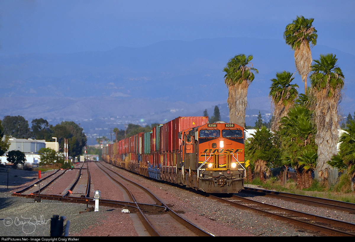 BNSF Railway train S-ALTSCO1-23 approaches the Metrolink station in Buena Park, California, on May 26, 2018. A three-unit set of GE diesels leads this train: ES44C4 8258, Dash 9-44CW 1010 and ES44AC 6382 leads this train, heading from Alliance, Texas, to Long Beach, California.