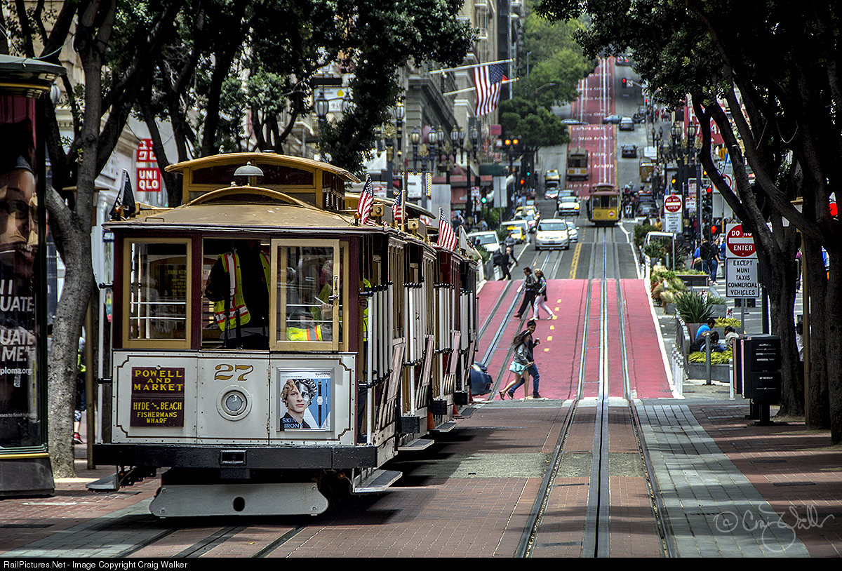In what looks like rush hour in San Francisco, California, is merely the end of the line as the Powell Street line terminates at Market Street. Four cable cars are lined up waiting their turns on the "armstrong" turntable so that they can begin their journey back to the Hyde and Beach Street stop near Fisherman's Wharf. In the distance, a cable car climbs Powell Street while another descends Powell to line up behind these four other cars. San Francisco Municipal Railway car 27, operating on Muni Line 60, was originally numbered 527 when built in 1887 by the Mahoney Bros., San Francisco, for the Ferries & Cliff House Railway (Powell Street Railway). The Mahoney Bros. subcontracted with Burnham-Standeford in Oakland, California, to build its cars. Assigned to the Sacramento-Clay cable car line before the 1906 Earthquake and Fire, the United Railroads transferred it back to the Powell Street cable car lines in 1907. This car was extensively rebuilt by Muni at the Elkton shops in 1958. In 1973, it was renumbered 27. (San Francisco, California - June 15, 2018)