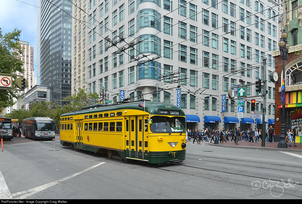 Rumbling down San Francisco's Market Street on June 15, 2018, is San Francisco Municipal Railway PCC car 1071, painted in the colors and markings of the Twin Cities Rapid Transit system of Minneapolis-Saint Paul, Minnesota. Muni car 1071 was built in 1947 for Twin Cities Rapid Transit. It was among a group that TCRT sold to Newark, New Jersey, in 1953, operating on the Newark City Subway until replaced by modern light rail vehicles in 2001. The San Francisco Municipal Railway acquired these cars in 2004 and had them overhauled at Brookville Equipment Company. Some of the cars were put in service in early 2007, but were taken out of service for wiring problems, finally entering service once the problems were repaired - eventually.