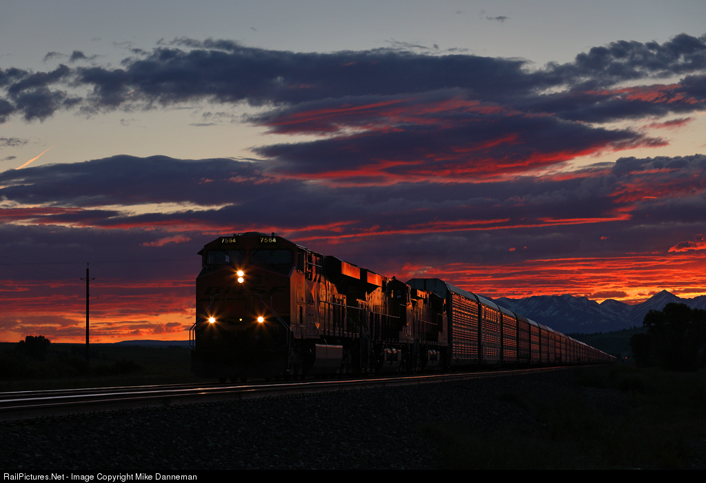 A setting sun lights up the undersides of receding clouds a brilliant red at the end of the day on June 24, 2019, as an eastbound BNSF vehicle train departs Quebec, Montana, after meeting two westbound trains in Quebec siding.