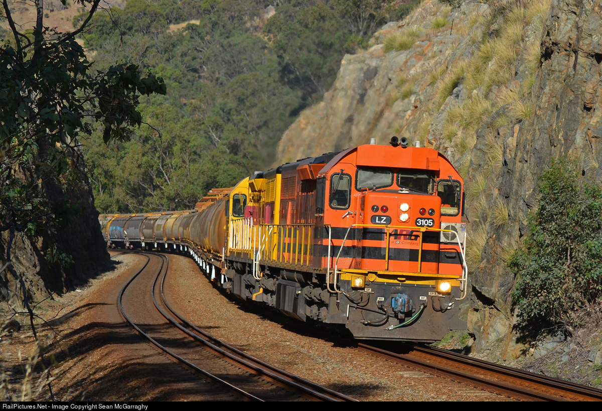 | Winding down into the Swan Valley through the number 1 cutting at Brigadoon, LZ3105 & LQ3121 work 1056 loaded grain from Avon Yard to Kwinana Grain Terminal with the now scrapped AGWY & AGSY grain rake. |