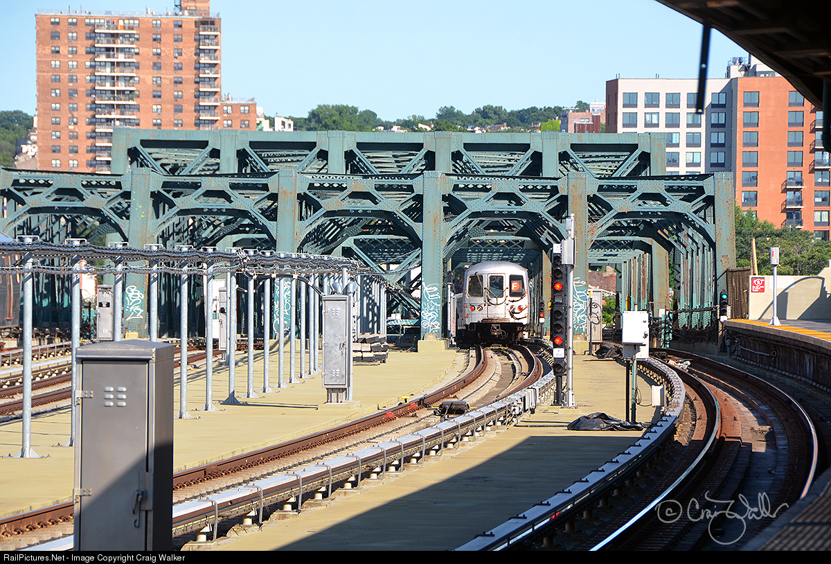 An F Line "Queens Boulevard Express" subway train has passed through the MTA's Smith-9 Streets station in Brooklyn, New York, which is the highest rapid transit station in the world. As such, this line features some impressive through truss bridges, built to accomodate the four tracks and, in the center, electrical cabling. There are several of these impressive bridges on this elevated line, including right in the Smith-9 Streets station itself (just behind the photographer). [New York NY - July 20, 2018]