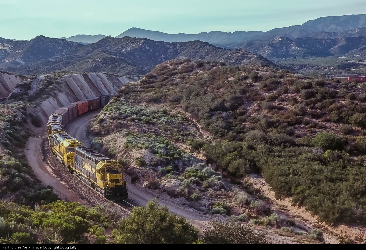 When getting into the section of Cajon between Cajon Junction and Summit, we found the area to be quite frustrating. If we set up for a shot on one of the three trackage alignments, trains would only run on the other two. If we set up for a train in one direction, trains would run in the opposite direction. Here is an example as a westbound Santa Fe train runs on the north track near Mormon Rocks.