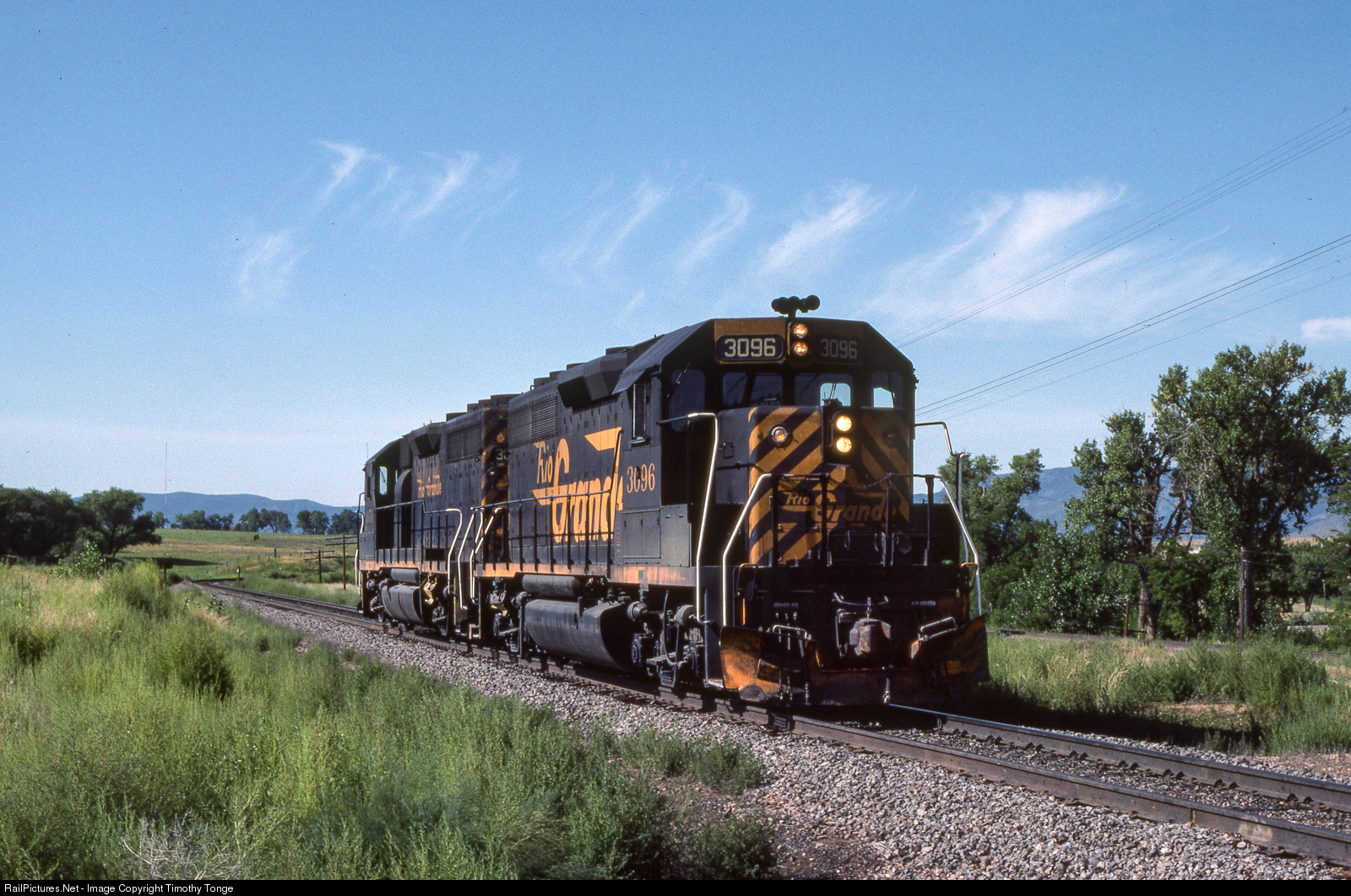 | DRGW 3096 leads a 2 unit helper set northbound at Littleton, CO, virtually on the spot that would later become C470. Aug 22, 1982. |