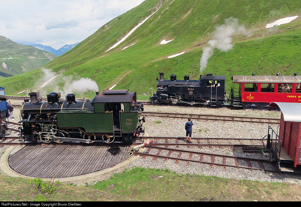| Furka 2160m asl: New HG 4/4 waits on the turntable until steam train from Oberwald toward Realp has arrived. 'BFD 9' on the black loc HG 3/4 means the former name 'Brig-Furka-Disentis' |