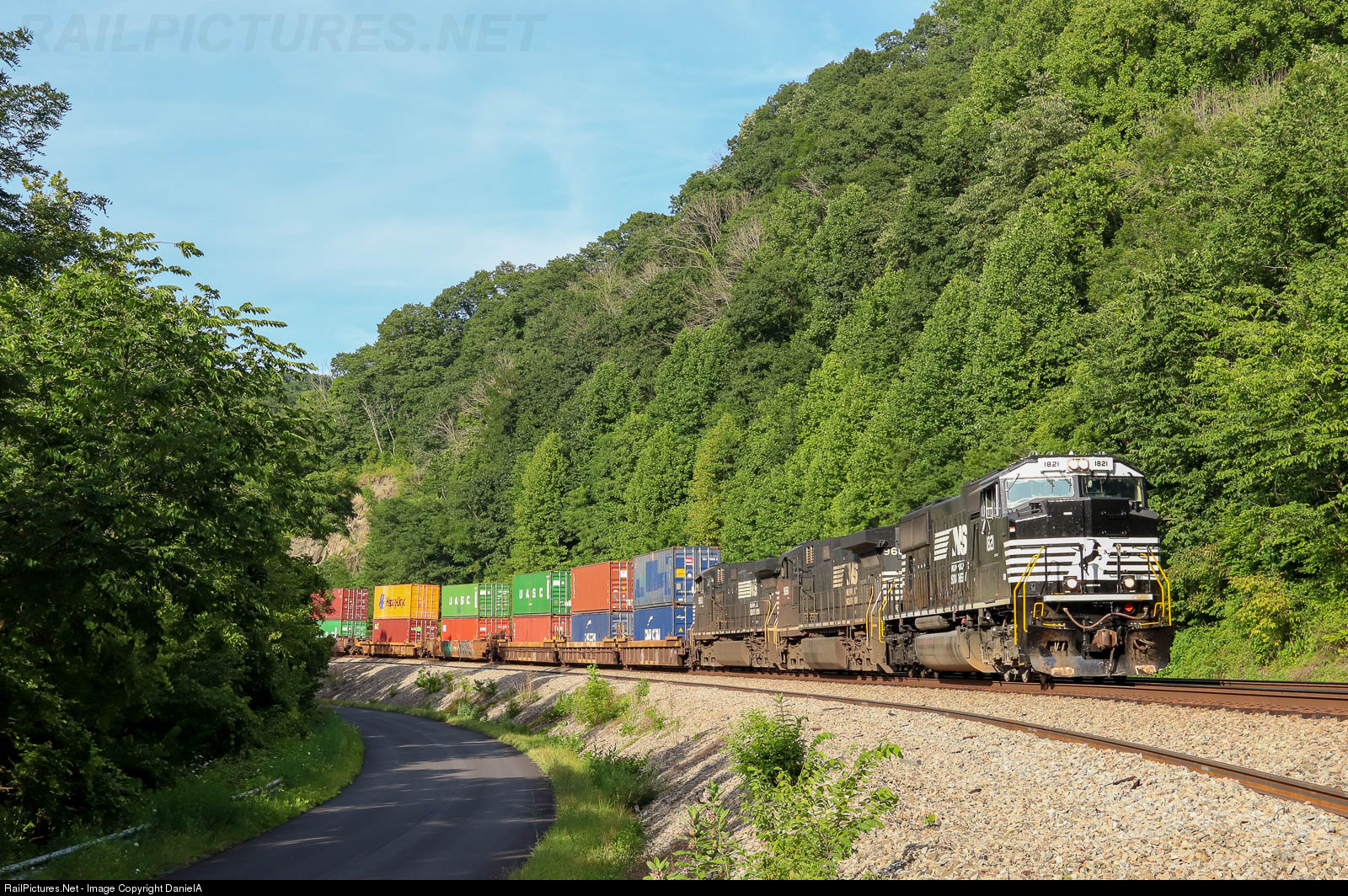 | SD70ACC 1821 pulls NS 29G west through a curve in Glen Lyn, Va. The West Virginia state line is just about half a mile ahead. |