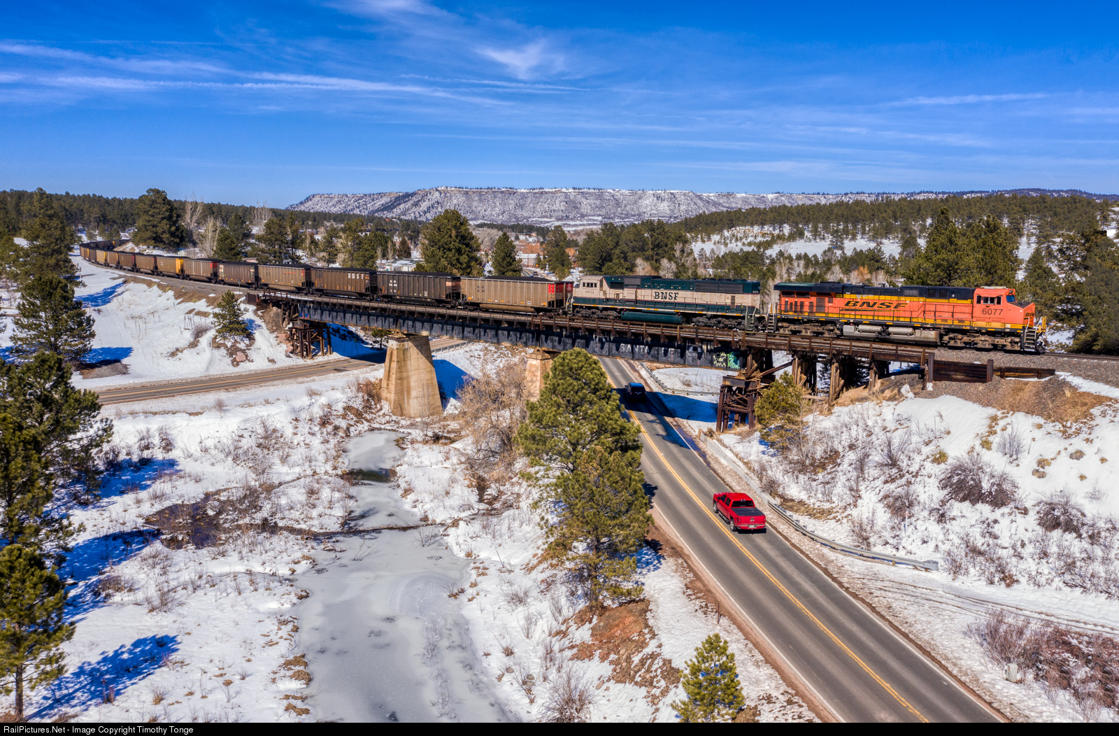| BNSF 6077 leads a soutbhound coal load over the old ATSF bridge at Larkspur, CO, on March 16, 2019. |