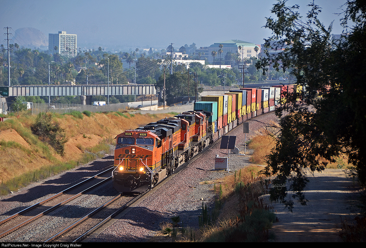 Ever wonder what is in all those containers heading to the ports? BNSF Railway train S-AMASCO1-14, passing through Riverside, California, on July 17, 2019, is carrying primarily cotton from Amarillo, Texas, heading to Long Beach, California, for export. This trian has the typical all-GE locomotive consist: BNSF ES44C4 8326, BNSF ES44AC 6093, BNSF Dash 9-44CW 5405 and BNSF Dash 9-44CW 4785.