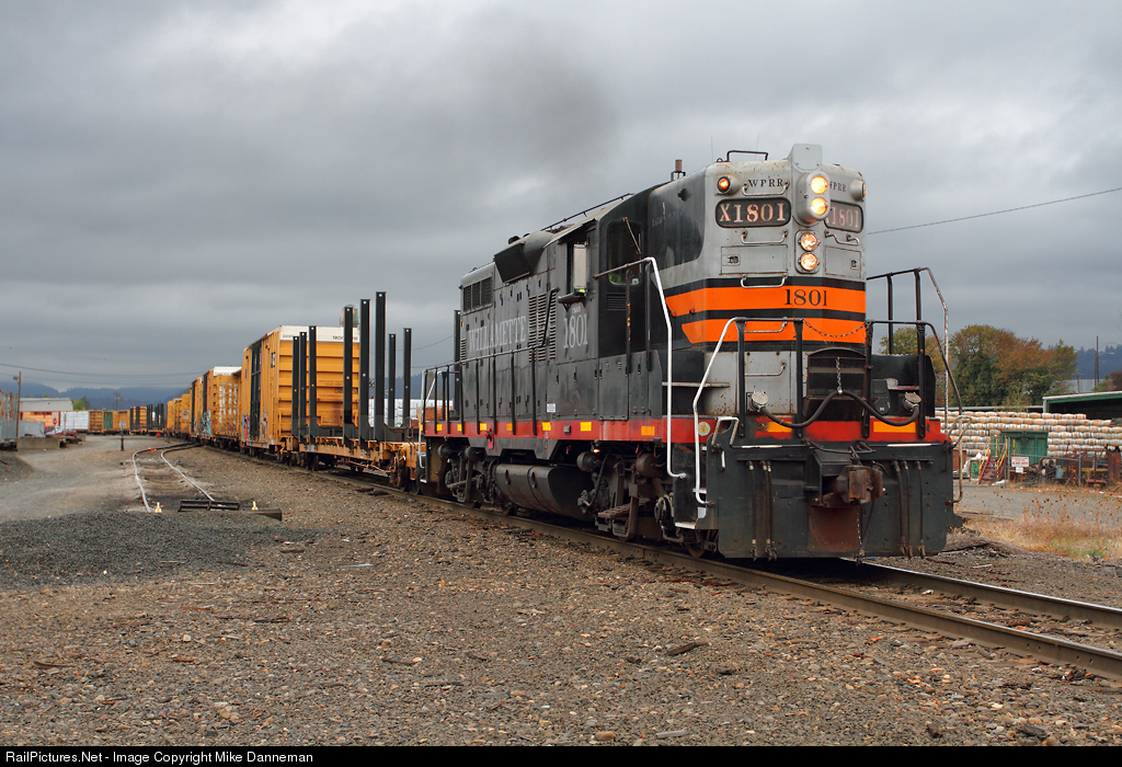 Dressed in classy Southern Pacific black widow colors, Portland & Western GP9 No. 1801 switches the PNWR yard in Eugene, Oregon, on the morning of September 27, 2016. The 1959-built EMD is lettered for previous owner Willamette & Pacific. Note the Mars light in use instead of ditch lights.