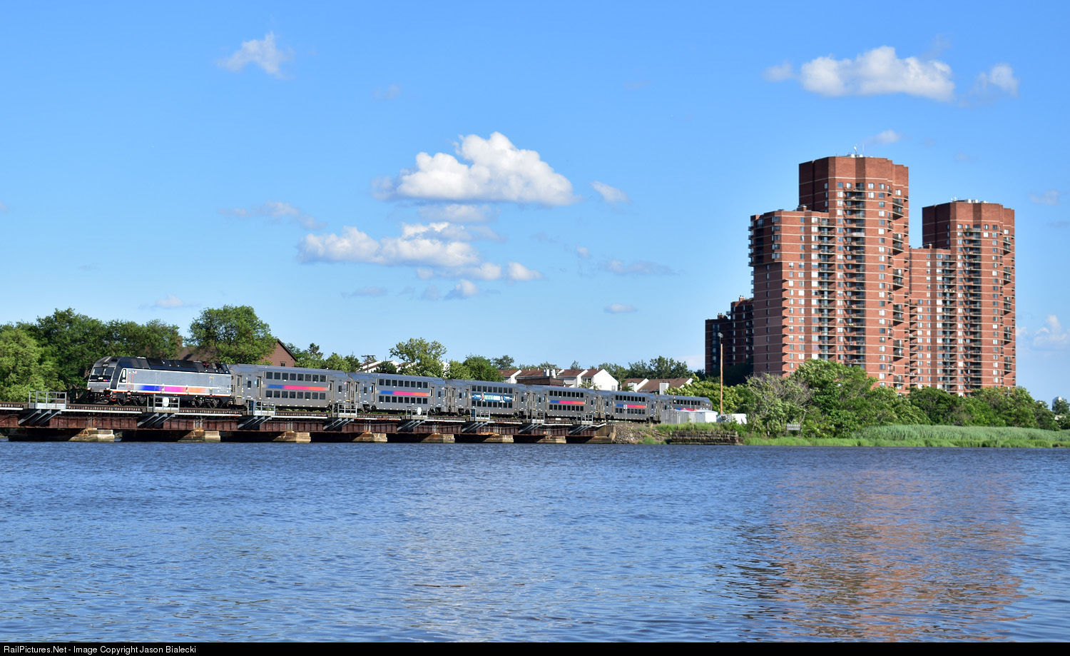 Multilevel train passes in front of a high-rise apartment in Secaucus as it crosses the Hackensack River.