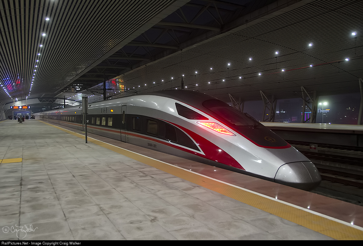 China Railways High-Speed train G6502 makes a stop at the Humen Station in Humen Town, Dongguan City, China, on October 22, 2018. This Fuxing (复兴号) train originated at Hong Kong West Kowloon and is traveling to GuangZhouNan. As evidenced by the red lights, this is the rear of the train - the stop wasn't long enough for me to get to the front after getting off it before it departed! These trains are punctual and fast - the highest speed I noted while riding it a relatively short distance was 305 km/h (189.5 mph), and the ride was smooth as glass at that speed, and much quieter and more spacious than an airliner. This "bullet train" system is impressive, and greatly needed in the US. I am hopeful that Californians will not give up on the high-speed rail that is currently under construction, and these are certainly preferable to flying, given the hassles of TSA security needed to board a cramped aircraft these days.