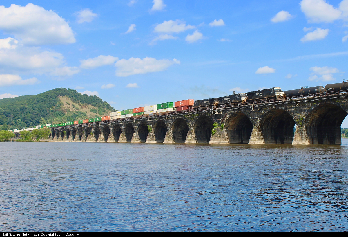 NS 7547 leads a westbound doublestack across the Rockville Bridge while a westbound manifest slowly works its way towards Enola yard.