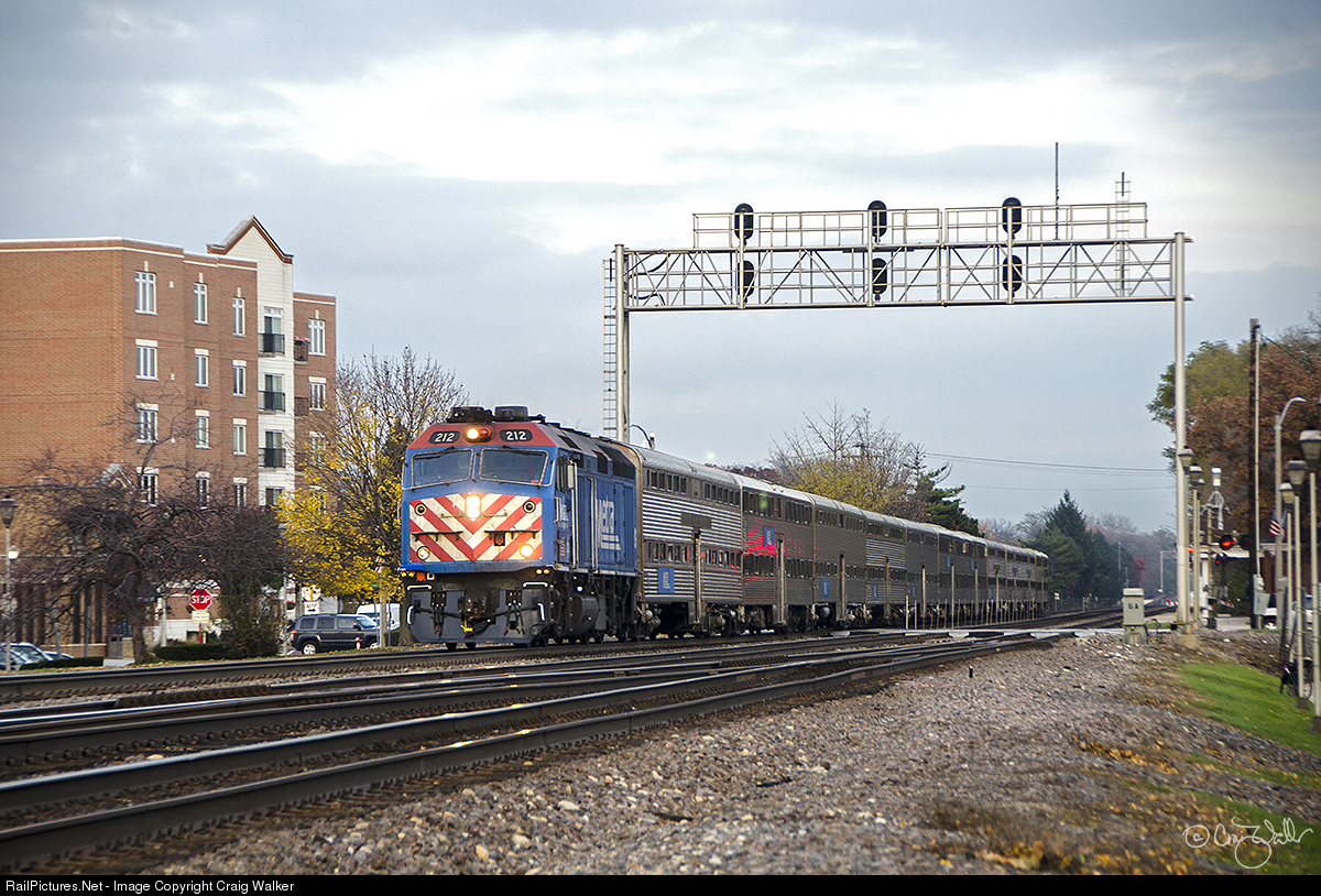 Following the autumnal time change, the sun sets early. As it does, Metra train 1245 makes its stop in Brookfield, Illinois, as it makes its daily (well, on weekdays) trip hauling weary workers from their jobs in downtown Chicago to the suburbs between the city and Aurora. Metra F40PHM-2 212 leads the train, pulling eleven bilevel commuter cars. (November 8, 2018)