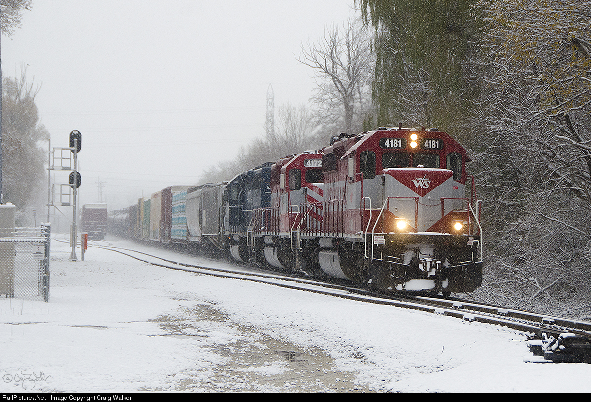 The first snow of the season has hit the Milwaukee, Wisconsin, area on November 9, 2018. Wisconsin & Southern train 4 makes its way through the storm in Waukesha, with a train led by WSOR SD40-2 4181, WSOR SD40-2 4172 and HLCX SD40 6334. While the snow looks as if it is heavy, the snowfall isn't very heavy at all - only about an inch and a half. But for this southern California native, it was a welcome change of pace. (At home, it was going to be about 80º F (26.67º C) and windy this day.)