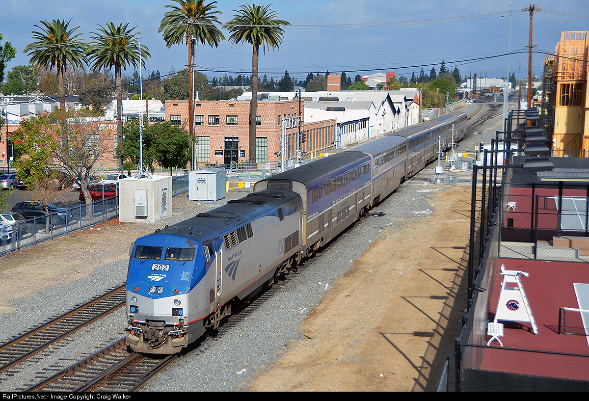 Amtrak Pacific Surfliner 767 heads to Goleta from San Diego on November 24, 2018. Amtrak P42DC 202 is shoving this train through Orange, California, next to the new tennis courts at Chapman University. With most of the twenty-year-old F59PHIs have been sent east to Chicago, and new owner Metra, P42DCs are filling in on the Surfliners until more of the new Siemens "Charger" SC-44 locomotives arrive. Ten minutes later, by the time southbound Pacific Surfliner 768 passes this same spot, there will not be much sun as the clouds quickly gather.