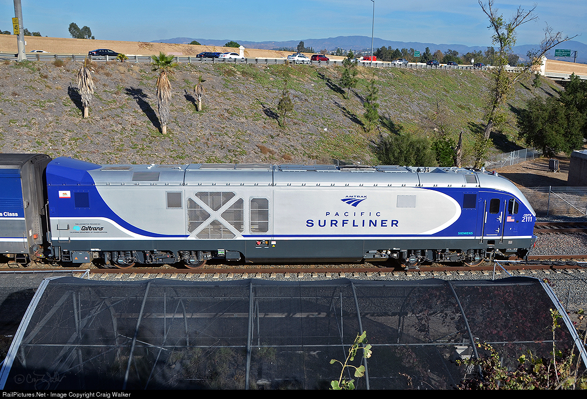 Running about an hour late, Amtrak Pacific Surfliner 774 passes under the Garden Grove Freeway (CA-22) on November 25, 2018. Making its way to San Diego from San Luis Obispo, this train is about 255 miles into its 350 mile journey along California's Pacific coast. This nine-car train has a new Siemens Charger at each end - CDTX SC-44 2111 up front, and CDTX SC-44 2113 on the rear.
