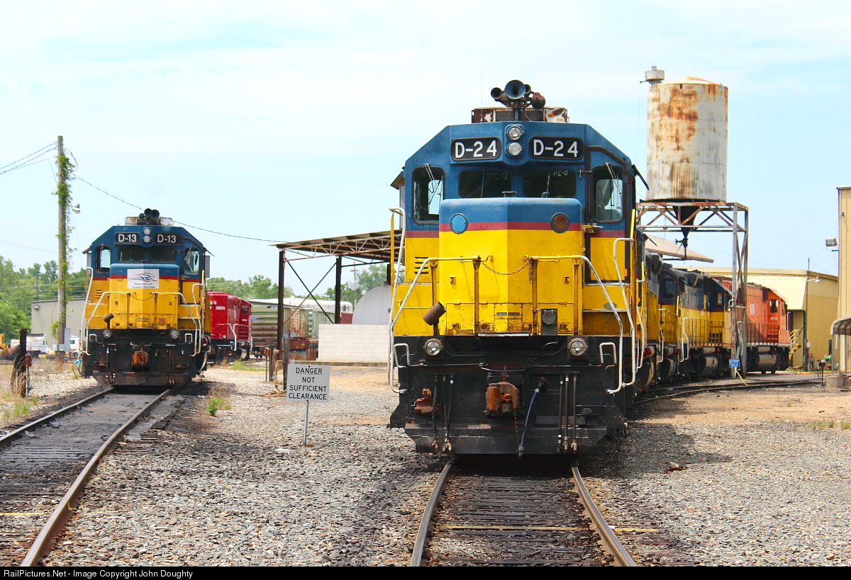 D-13 and D-24 from the Texas, Oklahoma and Eastern sit at the diesel service facility in the De Queen and Eastern yard. Photo taken with permission.