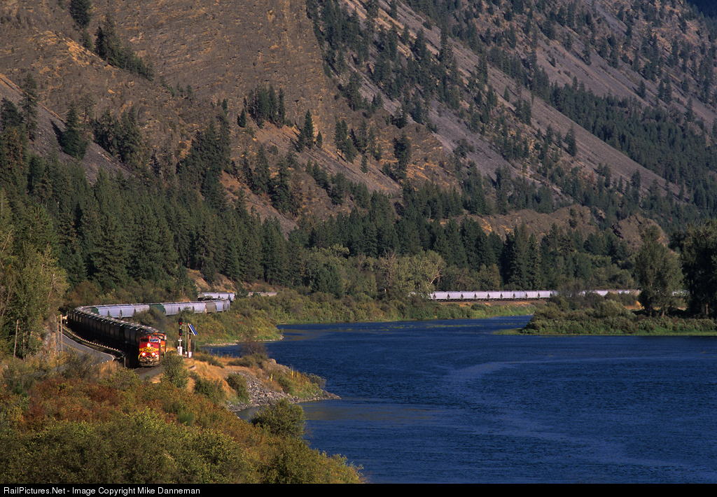 Westbound BNSF grain train GMASPSA foolows the curves of the Clark Fork at milepost 17 east of Eddy, Montana, on Montana Rail Link’s scenic Fourth Subdivision on the afternoon of September 11, 2010.